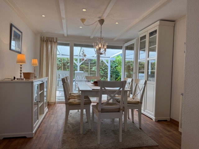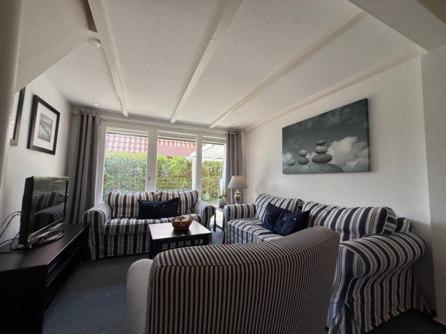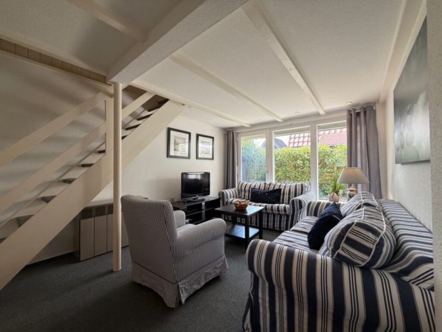 Das charmante Ferienhaus bietet auf vier großzügig geschnittenen Zimmern ein behagliches Zuhause auf Zeit. Im Erdgeschoss befinden sich eine gut ausgestattete Küche, ein Hauswirtschaftsraum, zwei helle Duschbäder, ein freundliches Esszimmer sowie ein maritim eingerichtetes Wohnzimmer. Sowohl das Wohn- als auch das Esszimmer führen direkt auf die sonnige Terrasse, die sich auf der Südwestseite des Hauses befindet – ideal zum Entspannen mit Blick ins Grüne. Im Obergeschoss erwarten Sie zwei geräumige Schlafzimmer.